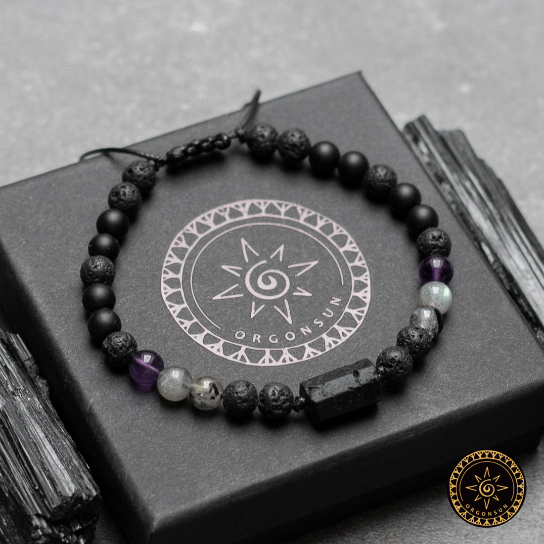Turmalin Czarny – duża surowa bryła w centrum bransoletki- najsilniejszy kamień ochronny.